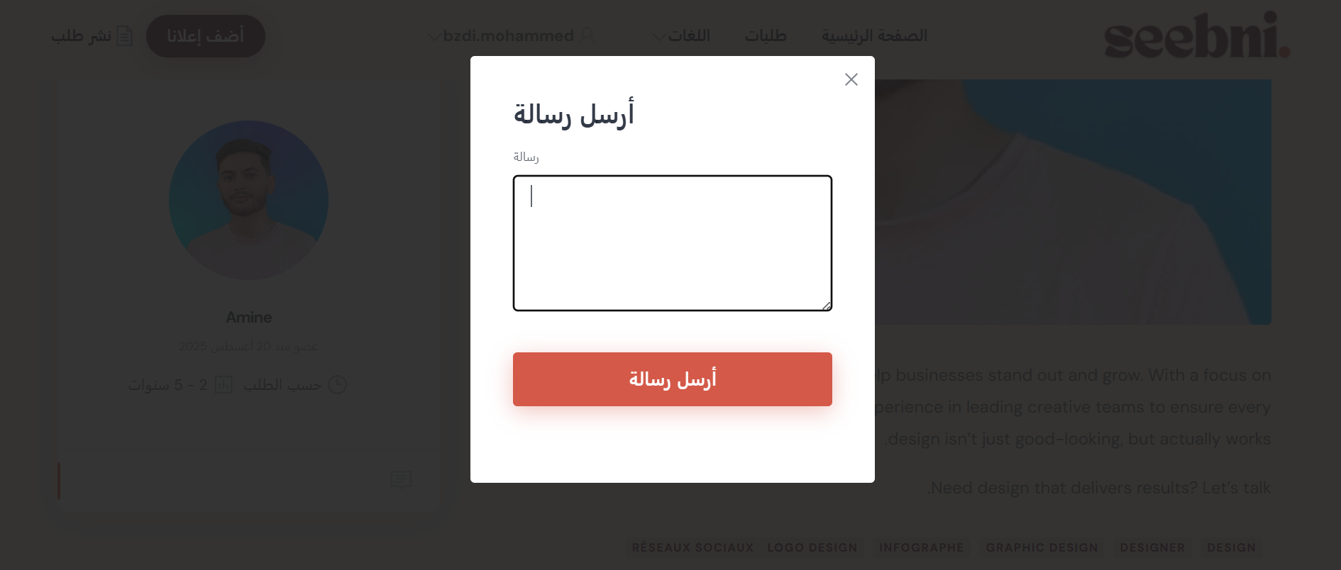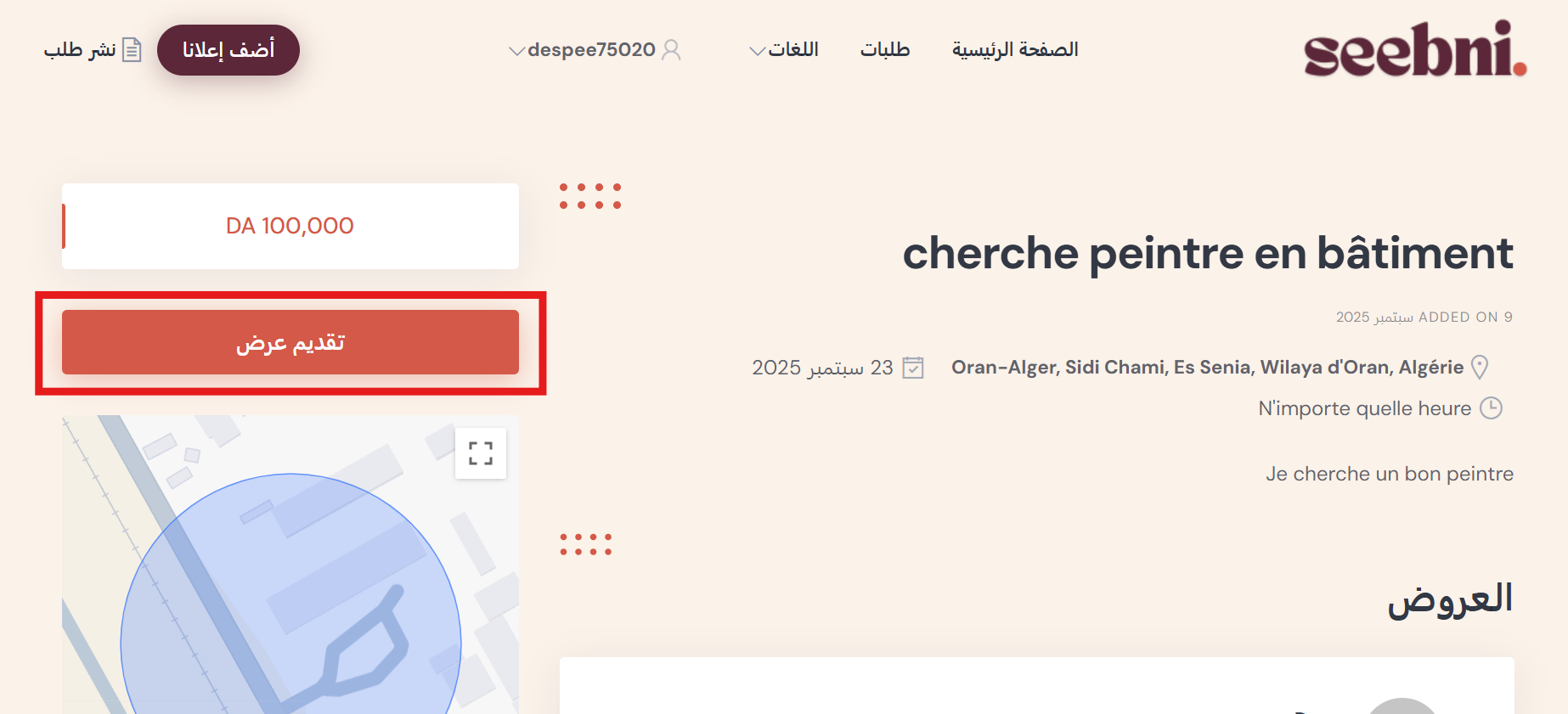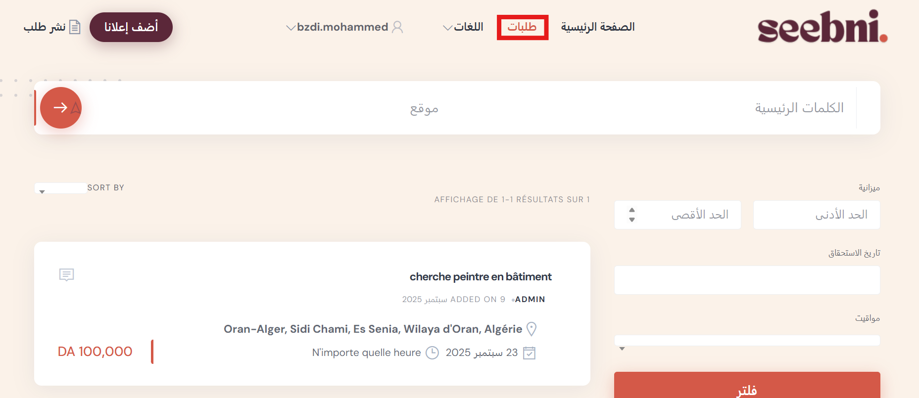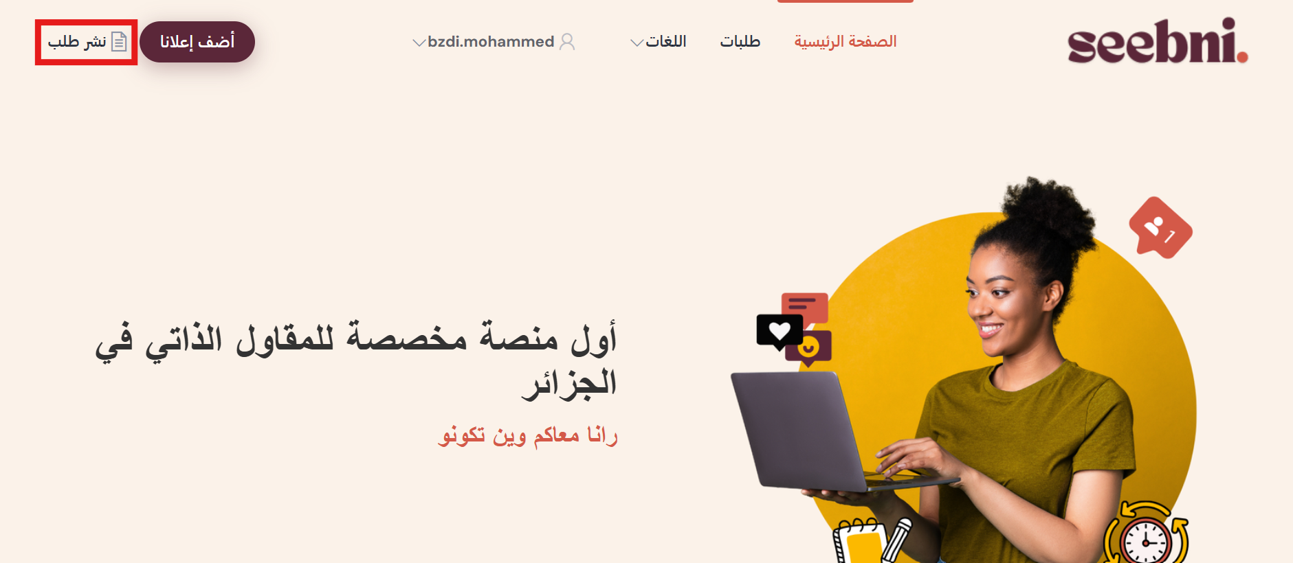 منصتنا تسمح لك بـ نشر طلب والتي سوف تكون مرئية على Seebni.comبفضل هذه الميزة، يمكنك التواصل مع الأشخاص المؤهلين العاملين لحسابهم الخاص أو المعلنين.